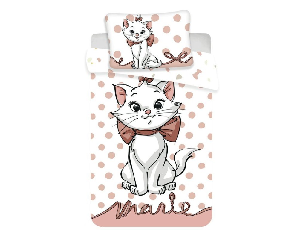 Povlečení je zdobeno obrázky kočky Marie v různých hravých pozicích, doplněné o jemné květinové vzory a pastelové barvy. Na polštáři je vyobrazena Marie s mašlí, což dodává celému setu šarm a půvab. Toto povlečení je ideální volbou pro všechny malé milovníky koček a zajistí jim pohodlný a klidný spánek.