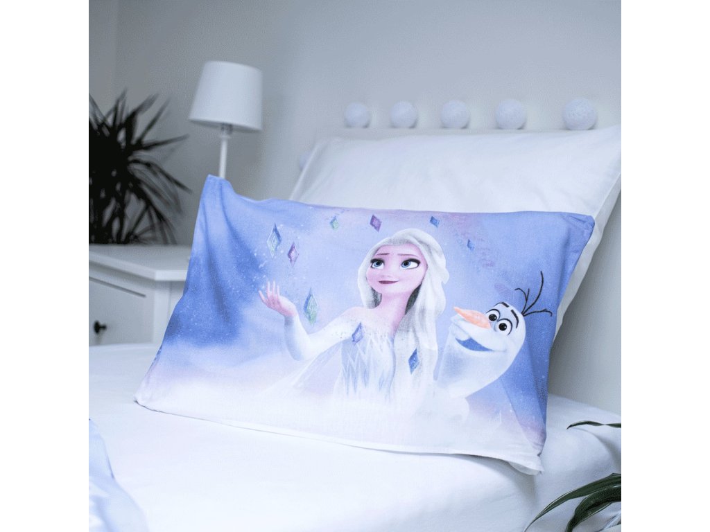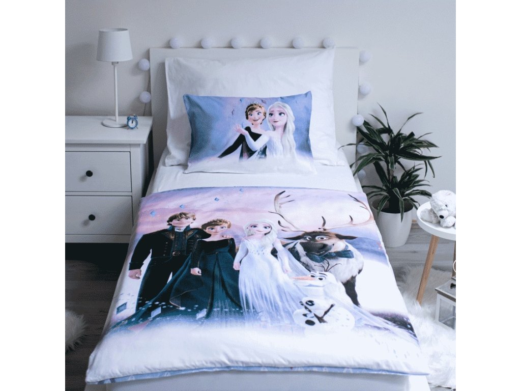 Toto kouzelné dětské povlečení do postýlky s motivem Frozen přinese vašemu dítěti radost a pohodlí. Přikrývku zdobí hlavní postavy z oblíbeného animovaného filmu Ledové království – Elsa, Anna, Kristoff, Olaf a Sven – na pozadí zimní krajiny s jemnými sněhovými vločkami. Polštář je dekorován portréty Elsy a Anny, které dodávají povlečení osobitý šarm.