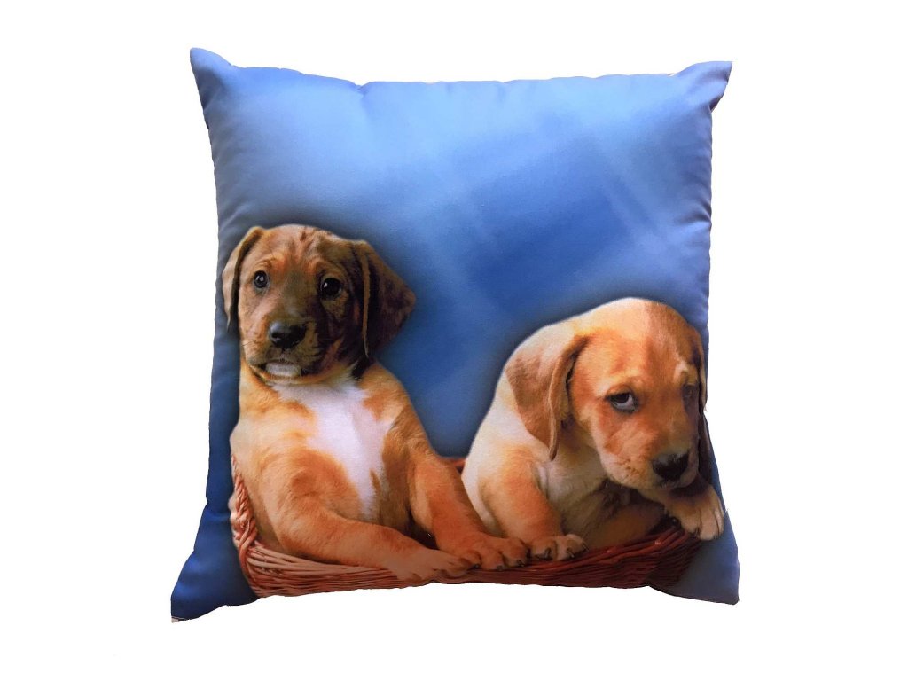Roztomilý polštářek s fototiskem dvou štěňat sedících v proutěném košíku na modrém pozadí. Jedno štěně má světle hnědou srst s bílými znaky, druhé je tmavší a opírá si hlavičku o okraj košíku. Ideální dekorace pro milovníky pejsků.