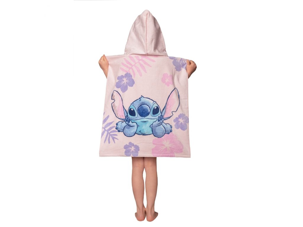 Stylové pončo s motivem Lilo a Stitch přináší radost a pohodlí po každém koupání! Přední stranu zdobí Stitch sedící s ušima nahoru, zadní stranu Stitch sedící s ušima dolů – to vše na růžovém podkladu s fialovými a modrými květinovými vzory. Pončo je ideální jako osuška i župánek, a díky kapuci krásně zahřeje.