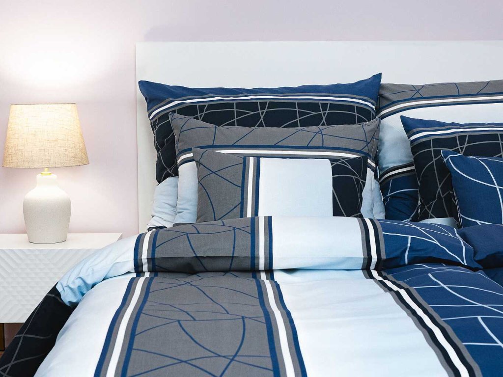 Stylové ložní prádlo s geometrickým vzorem Bruno modrý v odstínech modré, bílé a tmavě šedé přináší do ložnice moderní eleganci. Vzor tvoří horizontální pruhy s jemnými oblouky, které působí klidně a vyváženě. Povlečení doporučujeme kombinovat s prostěradly v barvě bílá, tmavě šedá nebo světle modrá. Vyrobeno v České republice firmou DADKA VRACOV.