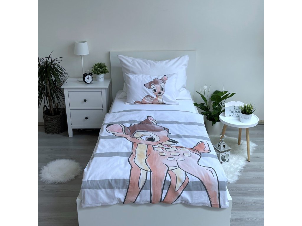 Skvělý dárek pro malé milovníky pohádek – povlečení Bambi Stripe baby přinese do dětského pokojíčku klid, pohodlí a kouzelnou společnost kolouška Bambiho.