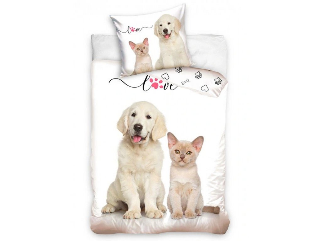 Zamilujte se na první pohled do roztomilého povlečení, které spojuje něhu a přátelství – bílý labradorský retrívr a béžové koťátko sedící bok po boku pod nápisem „love“, kde písmeno „o“ tvoří růžová tlapka, rozzáří každou ložnici. Polštář navíc zdobí drobné vzory tlapek, kostí a srdíček, které dodávají celému setu hravý a něžný vzhled.