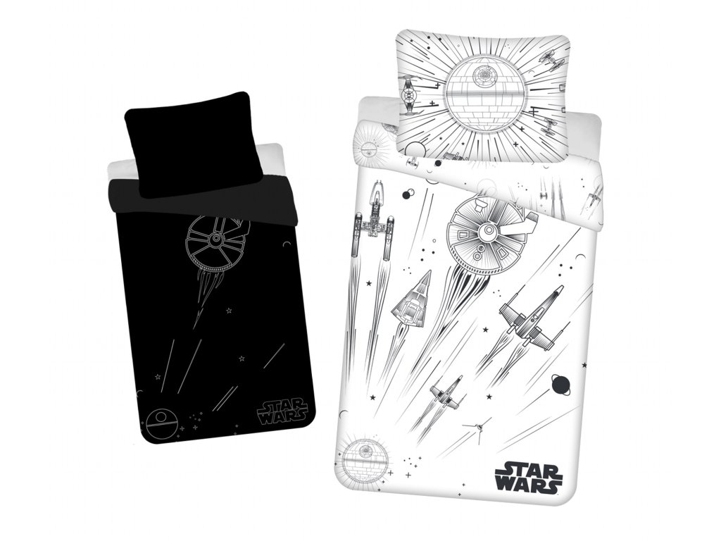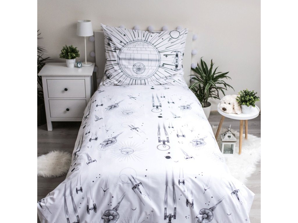 Toto povlečení je perfektní volbou pro každého fanouška Star Wars, který chce usínat pod ochranou temné strany Síly – nebo jen s pořádnou dávkou vesmírného stylu. Přikrývku zdobí galaktický motiv Hvězdy smrti a vesmírných lodí na kontrastním černobílém podkladu. Stylový polštář ladí s přikrývkou a dotváří celkový vzhled.