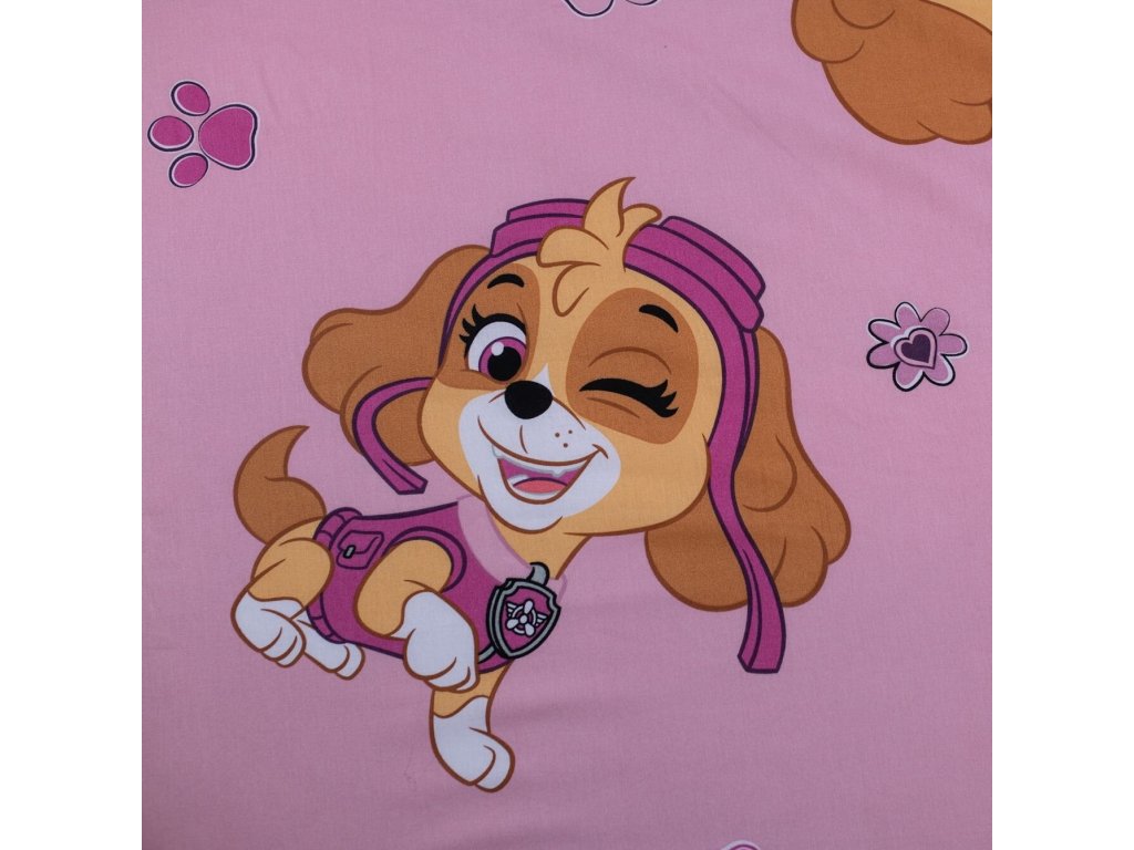 Roztomilé dětské prostěradlo s motivem oblíbené psí hrdinky Skye z animovaného seriálu Tlapková patrola. Růžový podklad zdobí opakující se obrázky Skye v různých pozicích, doplněné o květinky, srdíčka a tlapky. Ideální pro malé fanynky této odvážné pilotky.
