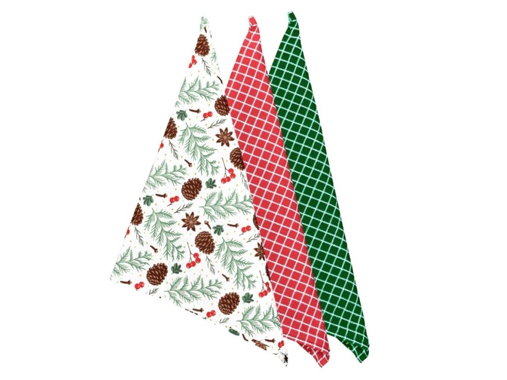 Stylová sada vánočních utěrek s motivem šišek, jehličí a bobulek doplněná o klasické kostkované vzory v červené a zelené barvě. Skvělý doplněk do kuchyně pro sváteční období.